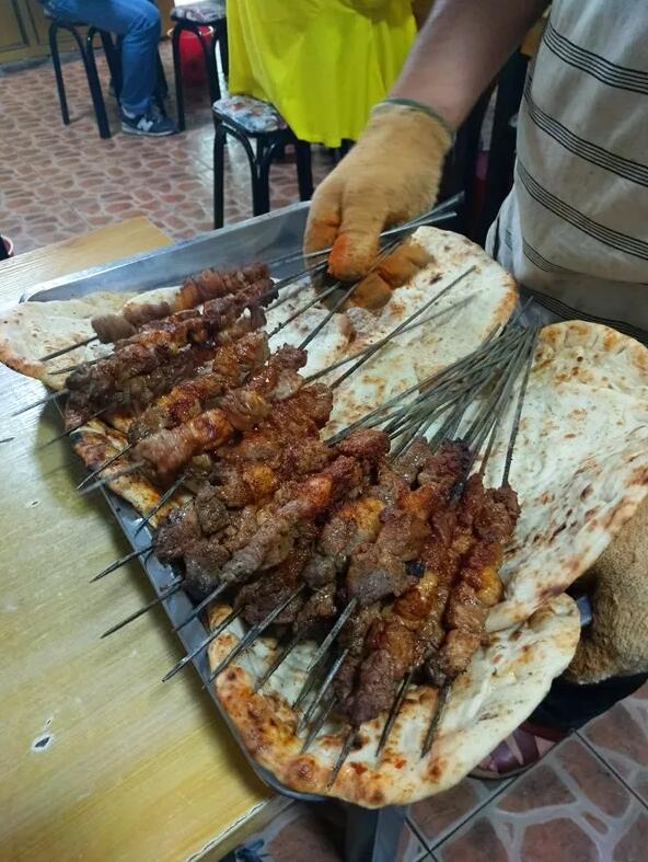 **貴州、雲南等西南省份的牛小串,講究串小、入味。**辣椒、蒜末、花椒粉、芝麻等五花八門的調料甚至有喧賓奪主的架勢,50串起擼,一切才剛剛開始;這些在新疆當然行不通,我們從北疆一路吃到南疆,比温度的升高更具有殺傷力的體驗,就是肉串的分量。起初在伊寧還能10串起點,到了庫車見到手臂一樣長的鐵釺子,就慫的再沒敢點超過一隻手的數量了。