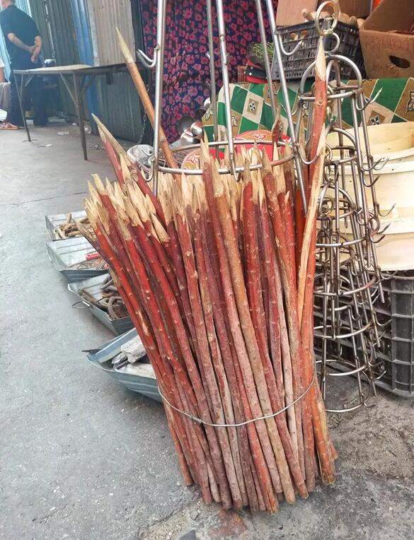 鐵釺手柄處的設計很有意思,有些是彎成一個圈,方便掛在饢坑裏;有些擰成了麻花,防滑好握;也有比較講究的木製手柄。一來因為鐵釺子導熱好,更適合傳導高温;二來也因為新疆本地不產竹子,竹籤大概是烤肉在傳播過程中一項“因地制宜”的發明。