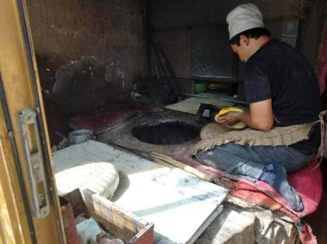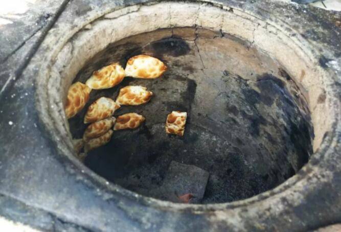 除了炭火烤制,新疆烤肉還有一大法寶,就是饢坑。饢坑最主要的用途是烤制新疆人的當家主食——饢。**現烤的饢,帶着一股麥子的香氣,即便空口吃也不會噎。**在新疆趕火車的日子裏,我們也習慣了像當地人一樣買兩個饢當乾糧。