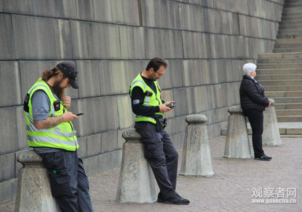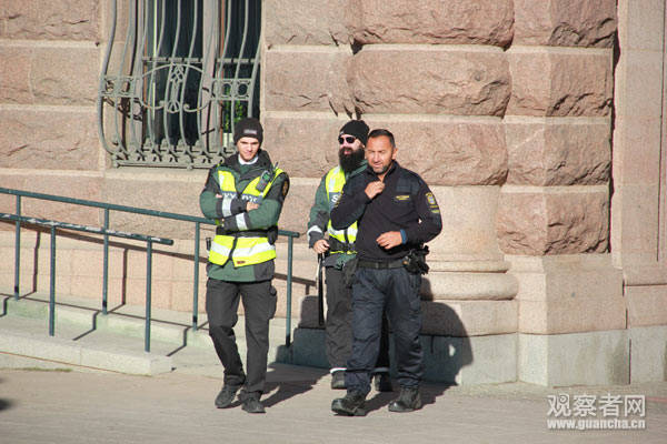 由於“墓地事件”的影響,筆者特意觀察了瑞典的警察。平心而論,見警率還是相當可以的,至少在旅遊點附近是這樣;警察基本都是三人一組巡邏,而且其中必有一名女警察,“墓地事件”中警察的配置似乎也是如此。有趣的是,一組警察中似乎總是會有一位大鬍子,不知是特意如此以行威懾,還是當地男士都偏愛蓄鬚。附帶一提,瑞典警察的精神面貌好像比較散漫,筆者週六上午遊覽斯市,結果議會大樓前的警察在圍成一圈歡聲笑語,皇宮前的則在埋頭玩手機。