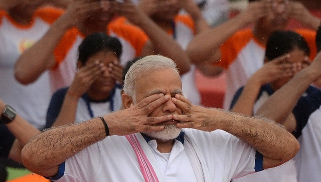 2017年6月21日,印度勒克瑙,印度總理莫迪加入集體瑜伽行列,慶祝國際瑜伽日。