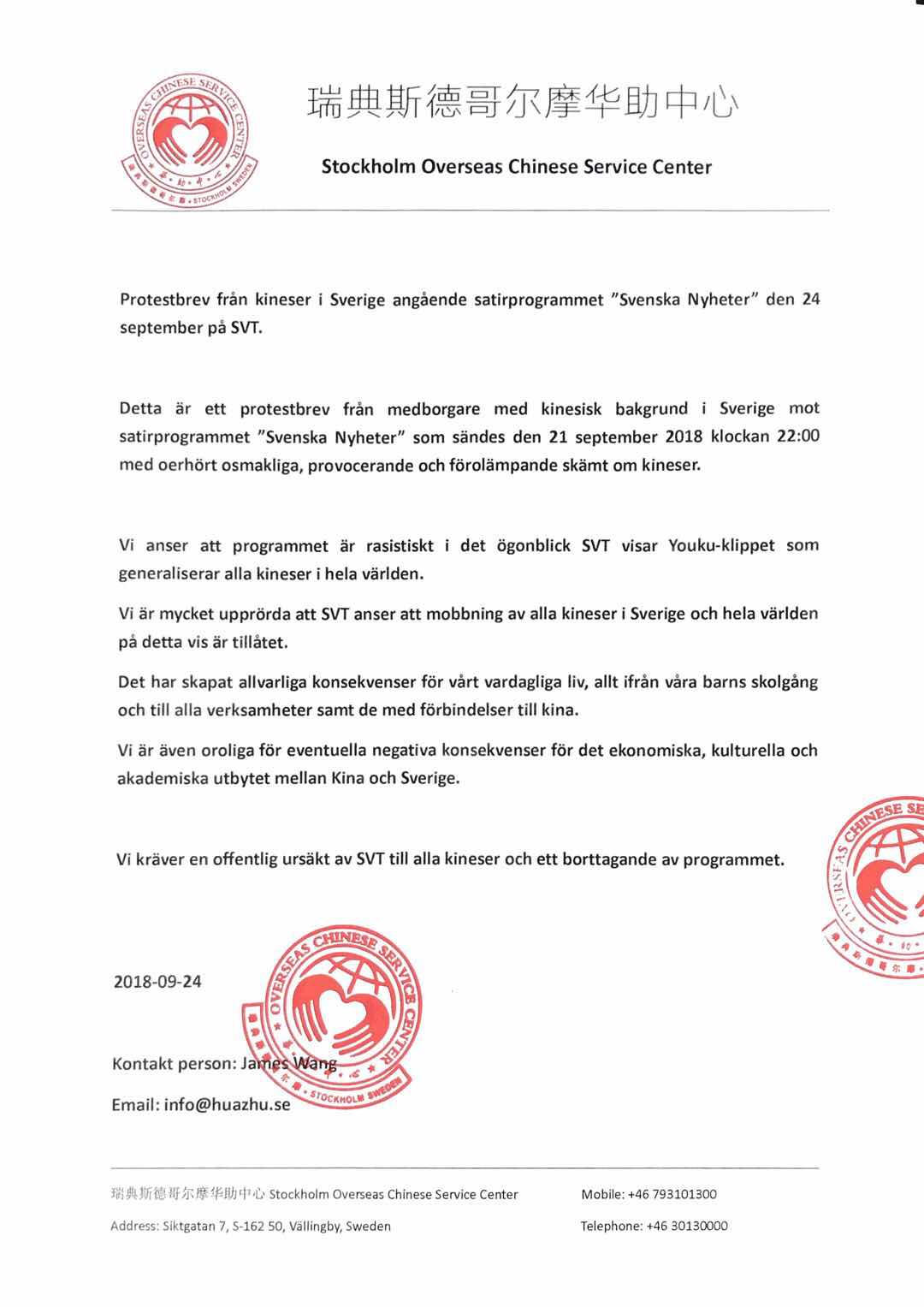附上瑞典華人各組織針對SVT辱華節目的聯合抗議信