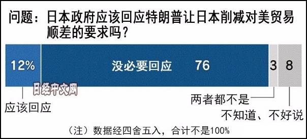 據日經中文網報道,近期實施的輿論調查中,對於美國總統特朗普讓日本削減對美貿易順差的要求,回答“沒必要回應”的受訪者達到76%,回答“應該回應”的僅為12%。