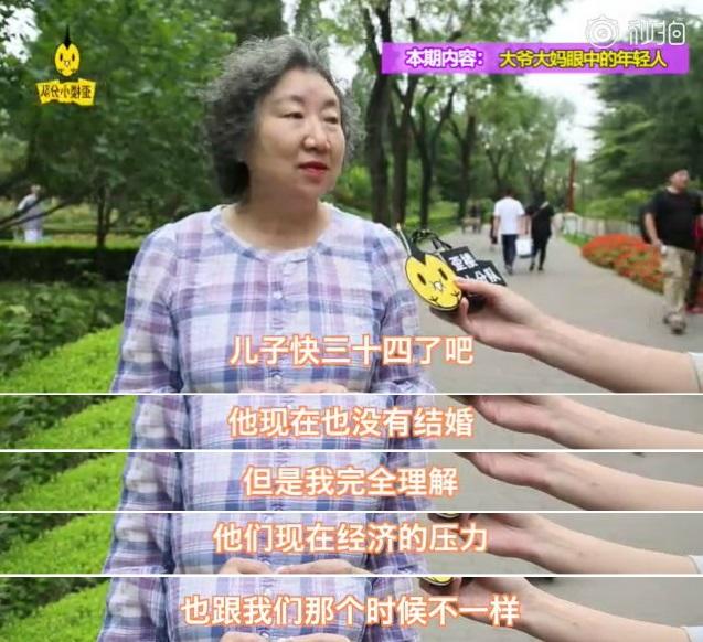還是這位穿格子的阿姨,她説自己的兒子現在34了,還沒有結婚,但是她完全理解,很重要的原因是現在年輕人面臨到的經濟壓力跟過去完全不能進行比較: