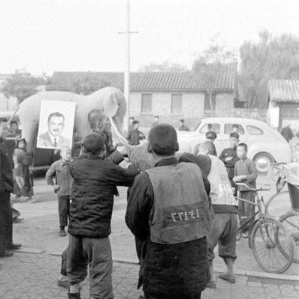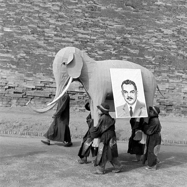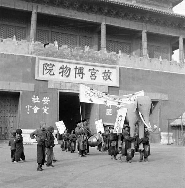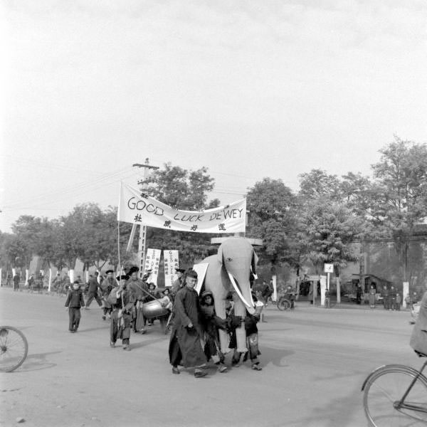 領頭一位領班,後面是四個小孩抬紙象,大象代表“驢象之爭”中的共和黨,這手藝一看就是辦白事的師父糊的。紙象上掛着杜威的大照片……