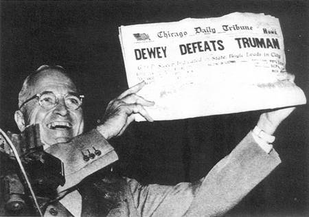當時杜威在美國各項民意測驗上都大佔優勢壓倒杜魯門。芝加哥論壇報甚至已經提前發出了祝賀杜威成為總統的新聞。
