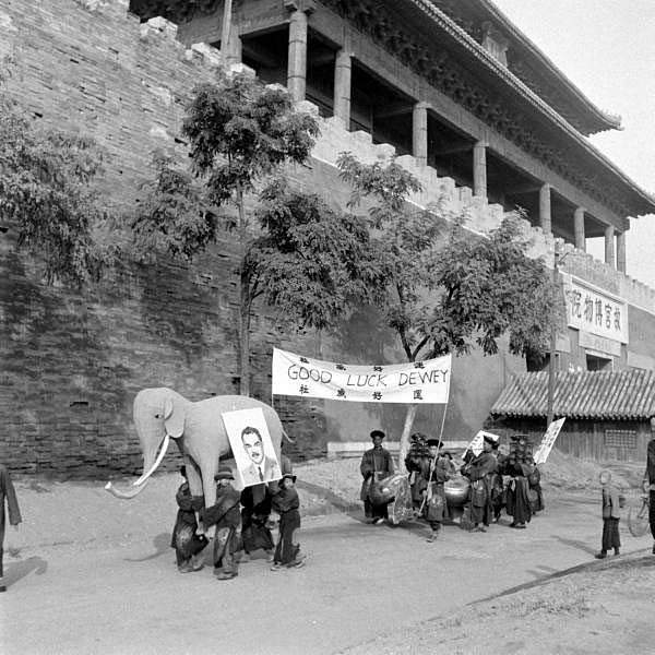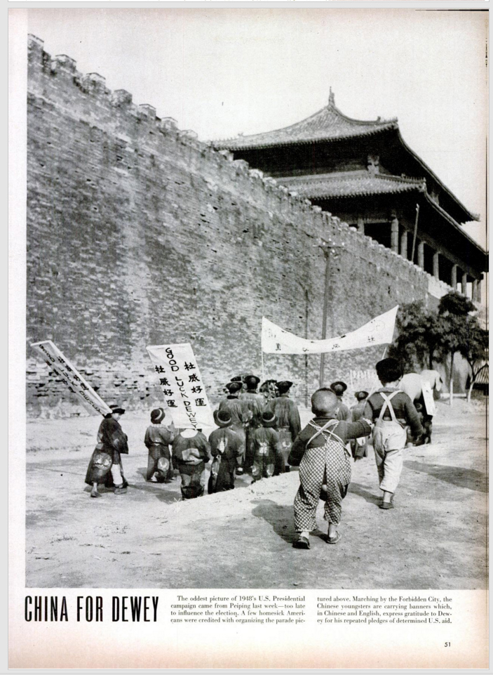 美國人最後也知道了這場助威活動。1948年11月8日的美國《生活》雜誌登了關於此事的一組30多張照片,一臉懵逼的描述“1948年美國總統競選中最奇怪的照片來自於北平,但是太遲了沒有對選舉產生影響。”“中國的年輕人正在攜帶中英文的橫幅,表示感謝杜威堅定的對美國援助的一再承諾”。
