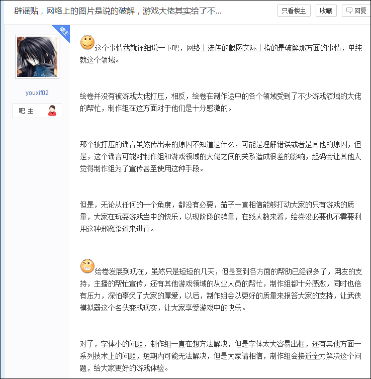 事件發生後,製作組在貼吧發表了闢謠帖。但是製作組只是對被打壓一事進行了闢謠,而沒有對破解進行闢謠。