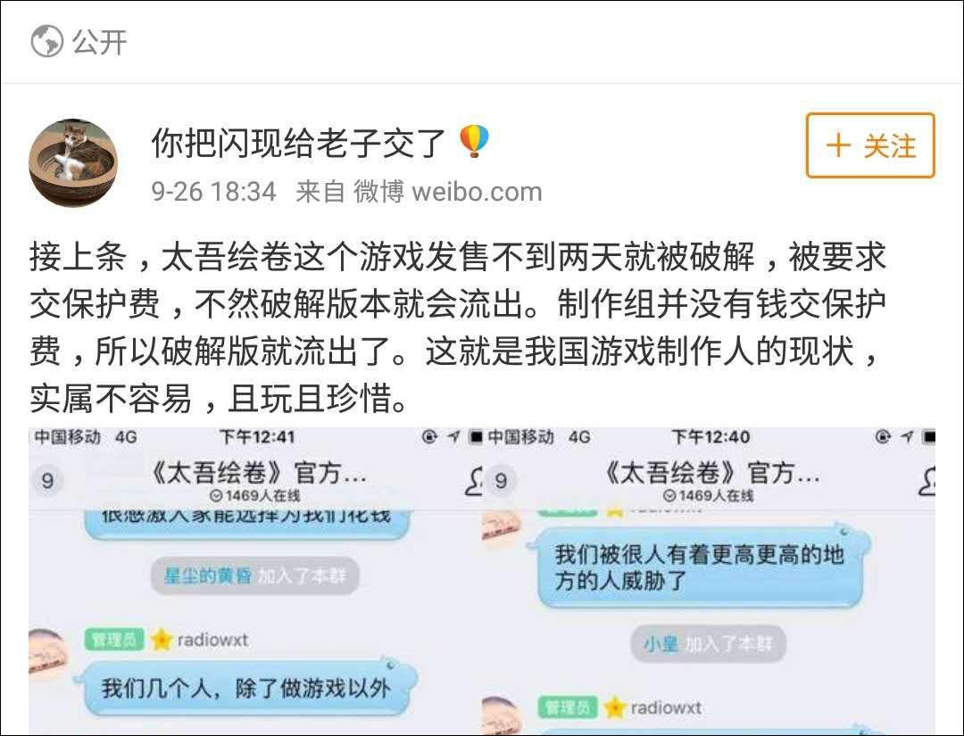 接上條,太吾繪卷這個遊戲發售不到兩天就被破解,被要求交保護費,不然破解版本就會流出。製作組並沒有錢交保護費,所以破解版就流出了。這就是我國遊戲製作人的現狀,實屬不容易,且玩且珍惜。