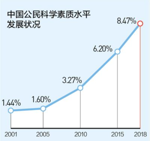 2018年9月18日,在首屆世界公眾科學素質促進大會上,中國科協發佈了第十次中國公民科學素質抽樣調查(簡稱調查)結果。調查顯示,2018年具備科學素質的公眾比例達到了8.47%。