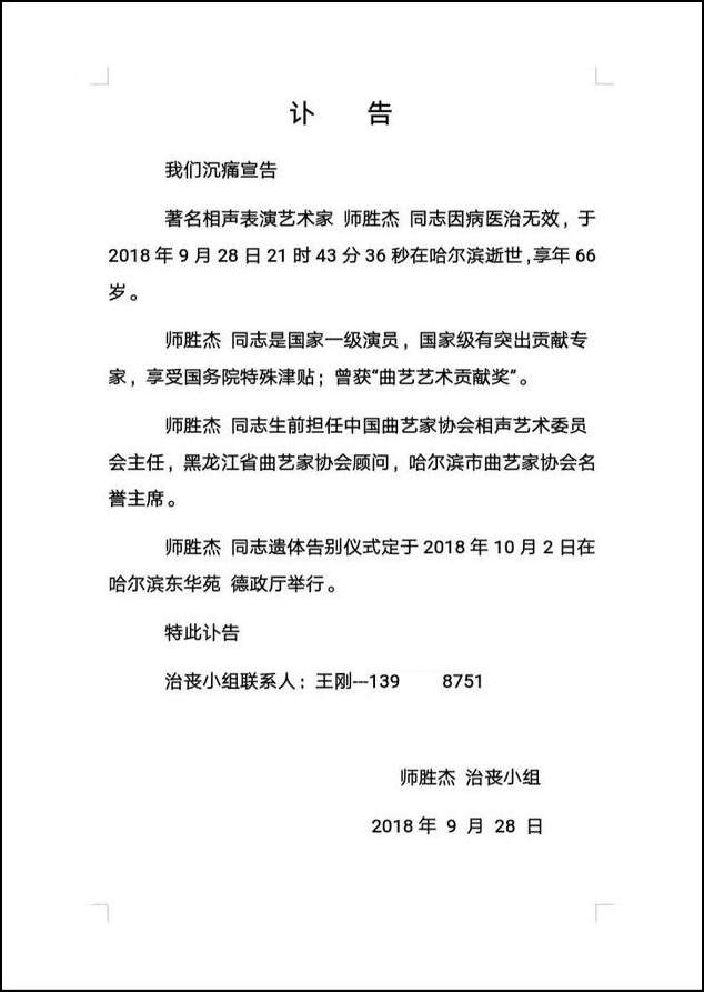 我們沉痛宣告著名相聲表演藝術家師勝傑同志因病醫治無效,於2018年9月28日21時43分36秒在哈爾濱逝世,享年66歲。師勝傑同志是國家一級演員,國家級有突出貢獻專家,享受國務院特殊津貼;曾獲”曲藝藝術貢獻獎”。師勝傑同志生前擔任中國曲藝家協會相聲藝術委員會主任,黑龍江省曲藝家協會顧問,哈爾濱市曲藝家協會名省主席。師勝傑同志遺體告別儀式定於2018年10月2日在哈爾濱東華苑德政廳舉行。