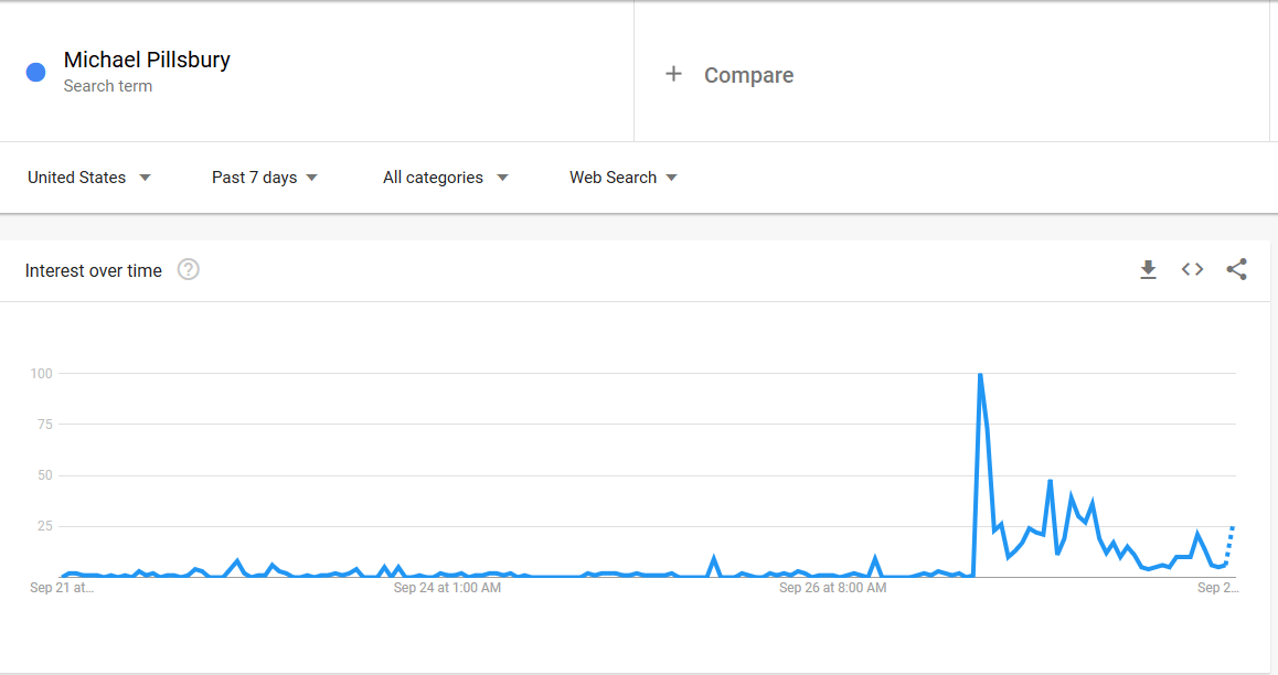 這下白邦瑞瞬間成了知名人物,9月26日後,搜索白邦瑞名字的谷歌指數,一下子拉昇幾十個數量級。