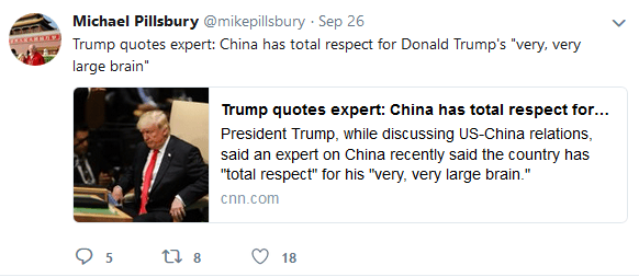“白邦瑞先生,這位美國頂呱呱的頭號中國問題權威,從北京帶回消息説,中國很尊重特朗普,特別是特朗普天才的大腦!”