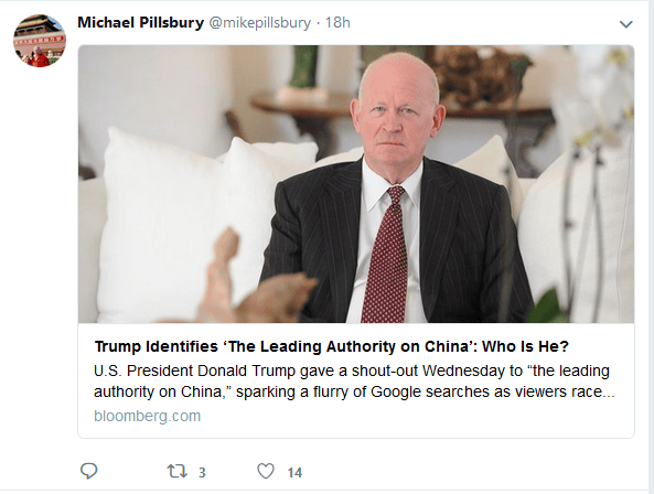 白邦瑞推特:彭博社文章《總統欽點的‘頂呱呱的頭號中國問題權威’,他是誰?!》