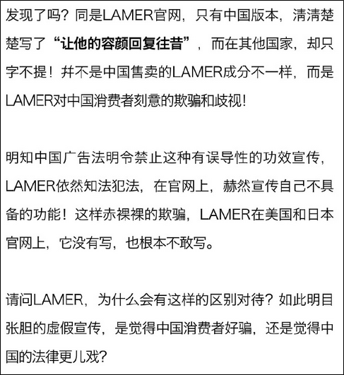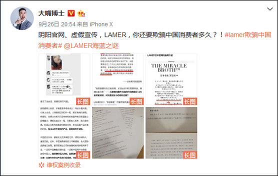 9月26日21點左右,微博上有一位博主@大嘴博士發了一條微博,指責La Mer陰陽官網,虛假宣傳,欺騙中國消費者。