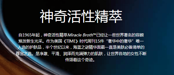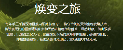 號稱是每年手工採摘深海巨藻向陽處前段1/3,通過長達3個月的天然生物發酵技術,讓珍貴無比的巨藻精純與多種天然礦植物萃取融合,如奇蹟點化,最終淬鍊出來的修護秘方。