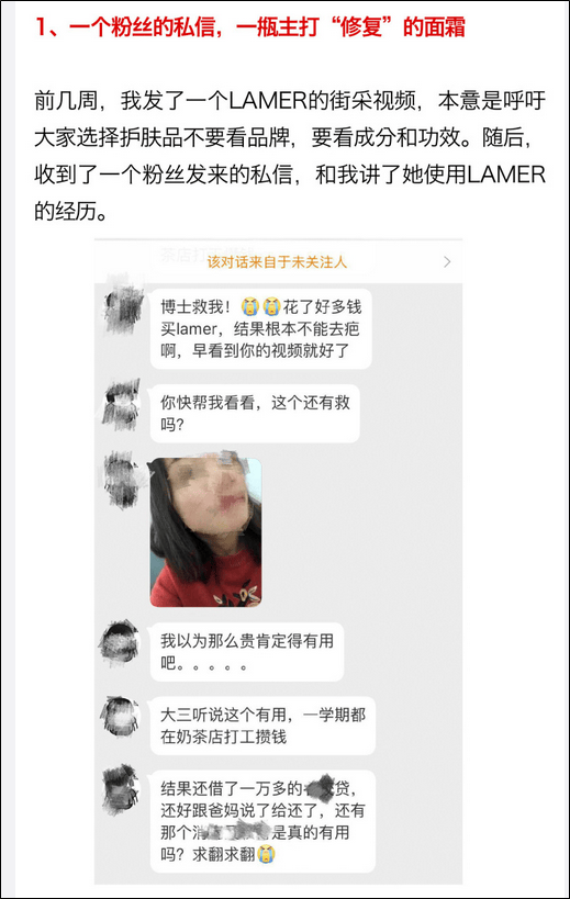 事情的起因是這位博主發了一個關於La Mer的街頭採訪,本意是呼籲大家不要盲目相信大牌,視頻發佈後,他收到了一位粉絲的私信,講的是她作為一個學生黨省吃儉用買了La Mer想要修復一下自己臉上的疤痕,結果沒有用,由於博主給粉絲照片打了碼,所以我們也不太清楚粉絲所説的“還有救嗎”到底是什麼情況,不過從語氣中可以猜測,應該是沒有好轉並且出現了其他問題。