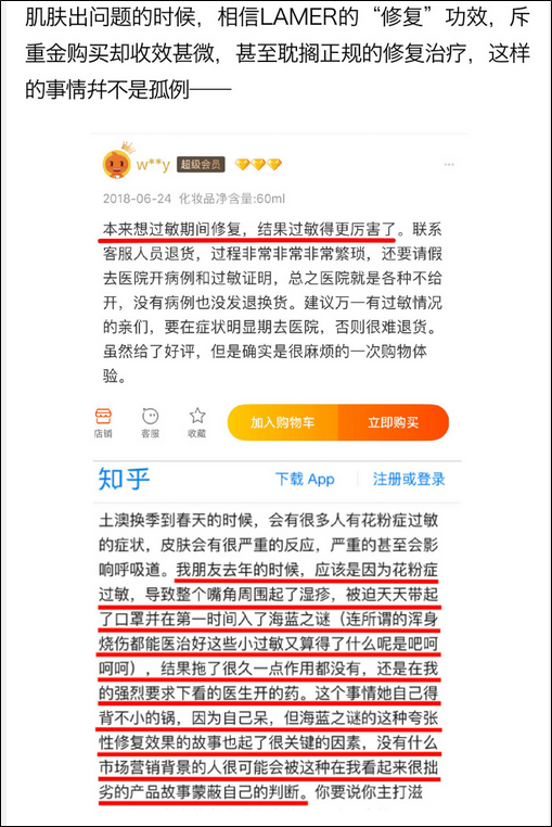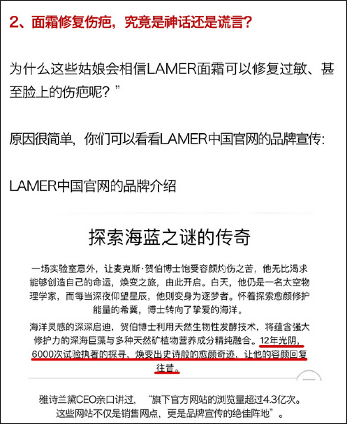 但是為什麼會有這麼多人相信La Mer有可以修復過敏甚至於疤痕的神奇功效呢?這位博主也給出了答案:海藍之謎中國官網的虛假宣傳。