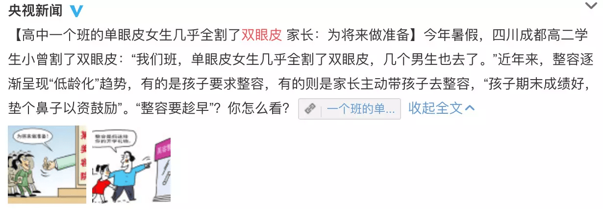 顏值正義,不斷裹挾着每一個女人。今天有一條新聞,標題赫然寫着“全班幾乎全部都割了雙眼皮”,更有家長喊着,“整容要趁早”。