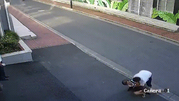 一位上了年紀的老阿姨在街上走着,後面一男子突然衝過來將她抱起,在空中狂甩。