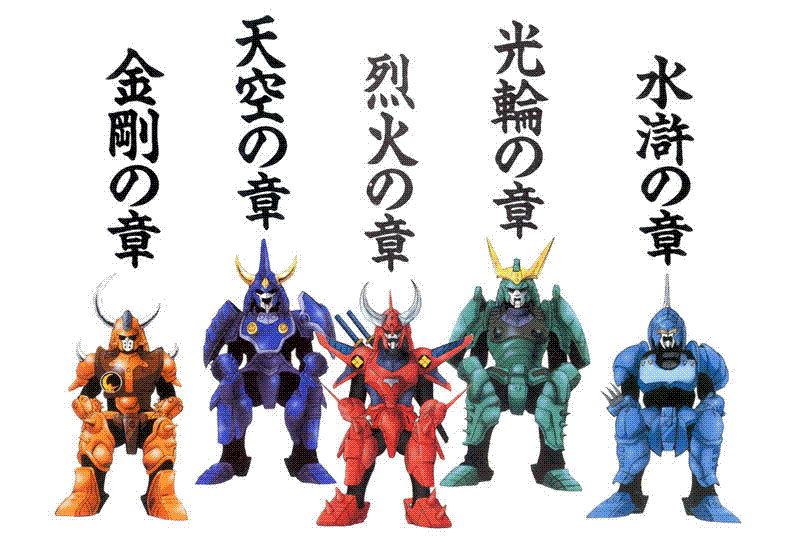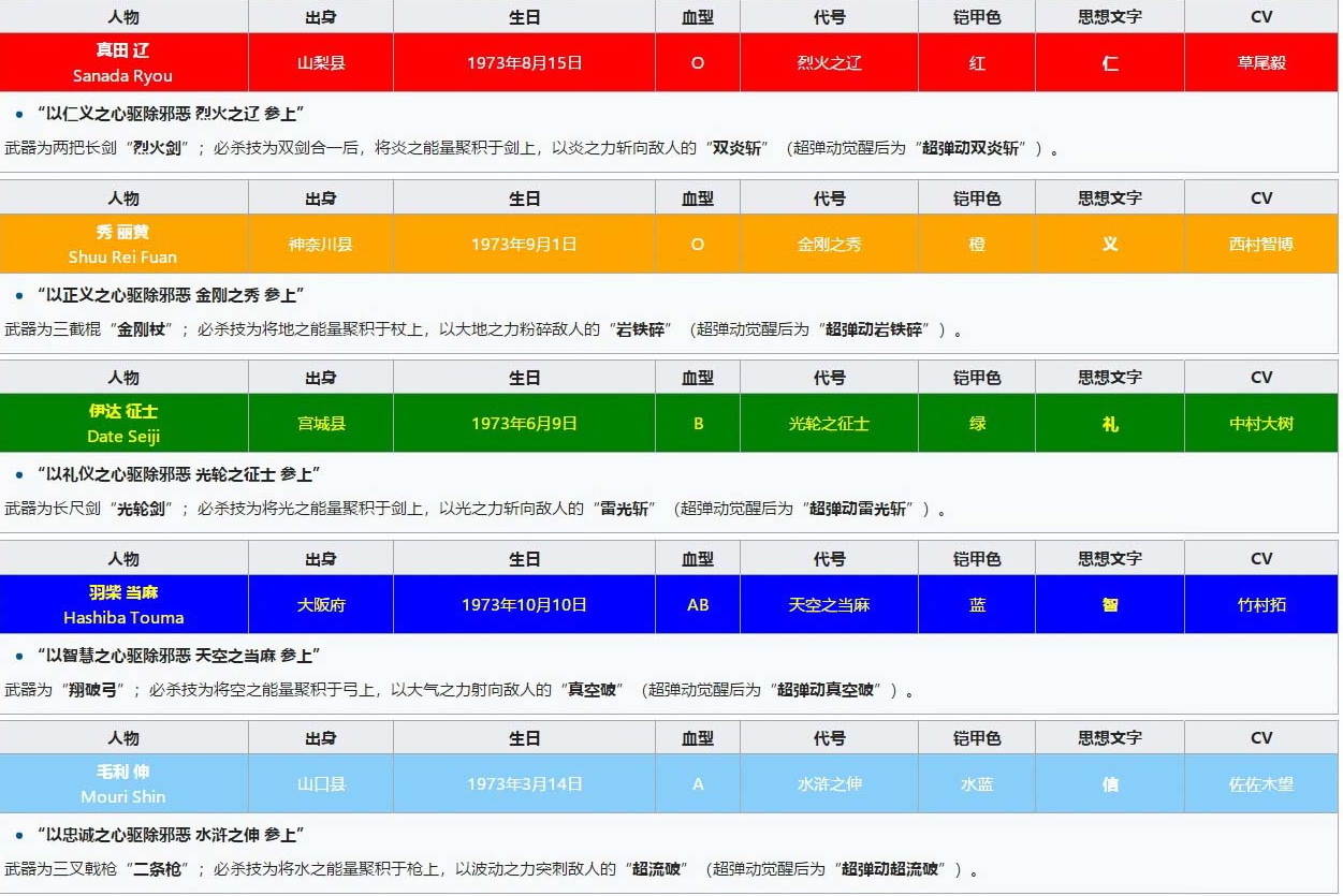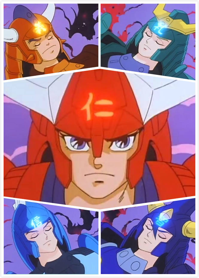 五位少年正確譯名應該是:仁戰士烈火真田遼,義戰士金剛秀麗黃,禮戰士光輪伊達徵士,智戰士天空羽柴當麻,信戰士水滸毛利伸。真田遼是真田忍軍的後裔,動畫中的鎧甲都有家族徽章。不過奇怪的是,遼並沒有使用真田家家徽,而是使用了真田家依附過的武田家割菱作為徽章。秀麗黃來自於清朝就移居日本的華僑家族,他的偶像是華人功夫巨星李小龍和成龍。伊達徵士、羽柴當麻、毛利伸分別是伊達政宗、豐臣(羽柴)秀吉、毛利元就的後人,從他們的姓氏、出生地和家徽就可以看出來。他們的造型和屬性也隱藏了不少的老梗,如伊達政宗是獨眼龍,伊達徵士也被設定為單眼受傷過的人,並一直用頭髮遮住一隻眼睛;毛利水軍戰國時期日本第一,毛利伸的屬性就被設定為水。