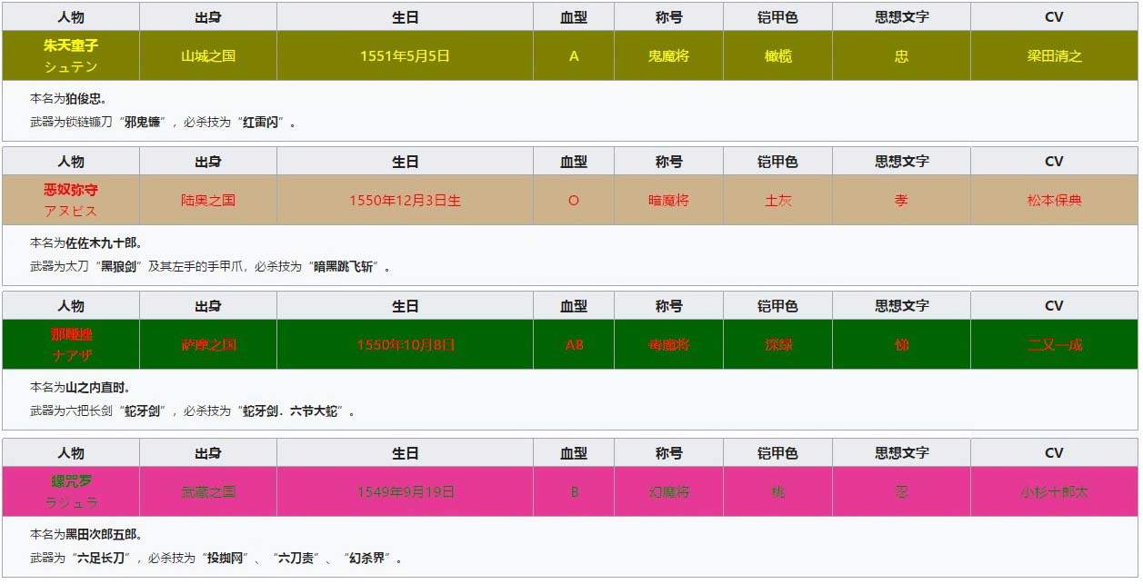 四倫魔將四魔將分別是:鬼魔將貴力朱天童子(本名狛俊忠),毒魔將藥師那啞挫(本名山之內直時),暗魔將漆黒惡奴彌守(本名佐佐木九十郎),幻魔將夢幻螺咒羅(本名黒田次郎五郎)。朱天童子設定來源於日本著名鬼王酒吞童子(日語“朱天”“酒吞”同音),因此是山城國人。那啞挫(Naaza)來源於印度毒蛇Naga,盔甲名藥師,來自於毒與藥本為一體的梗。惡奴彌守(Anubisu)是古埃及黑暗魔王阿努比斯(Anubis)。螺咒羅(Rajura)和阿羅醐(Aroga)是自創角色。