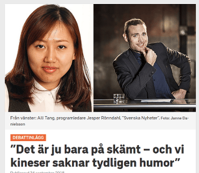 儘管我們都知道在定性上,瑞典國家電視台一直都認定是中國人誤讀了他們的幽默,然而在引用經過他們挑選出來的瑞典華裔的言論時,他們還是標註了言論僅代表其個人意見的免責聲明(見上圖)。我在這裏要補充説明一下,讀者不要因為電視台援引了一個瑞典華裔的言論,就認為這代表了瑞典華裔的一致意見。電視台為了給自己洗脱罪責,通常都會挑選符合自己立場的言論。如果要把公正性做得更好看一些,也應該同時發表兩個不同的觀點。這樣的選擇性挑選言論,其傾向性不言自明。有趣的是,到了9月27日,眼見事態有擴大化的趨勢,為了降低影響,瑞典最大的日報(這個是私營媒體)——Dagens Nyheter(《今日新聞》)發表了內容一模一樣的來自該瑞典華裔的文章,但是卻修改了標題——“Insändare: Sveriges Television sprider rasism om kineser”即《投稿:“瑞典電視台傳播針對中國人的種族歧視”》。注意哈,insändare是瑞典特定的文體,見其文體標識即知該文代表的是個人意見,並不是説《今日新聞》認同選用文章的新標題。該標題見諸報端的時候,華人微信羣裏一片歡騰!但是定睛一看,原來是文章早已經讀到過了,只是標題換了。瑞典媒體整體化一,相互協作的洗腦功底可見一斑!當然了,只要邏輯清楚的人,無論怎麼讀都很明白瑞典的自辯立場。