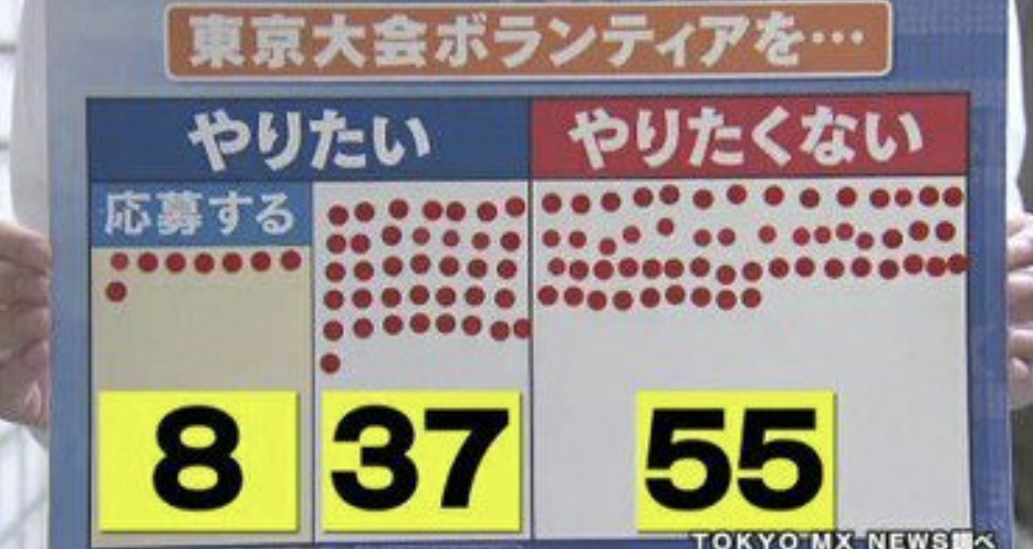 根據東京電視台最新的一項輿論調查顯示,超過半數大學生並不像當志願者,或是壓根就沒有這個意向與奧林匹克搭上關係。東京電視台向其中的100名學生直接提問,其中有45人表明願意參加或如果機會合適會願意試試當志願者,而有55人表示壓根就不想和奧林匹克有關係。