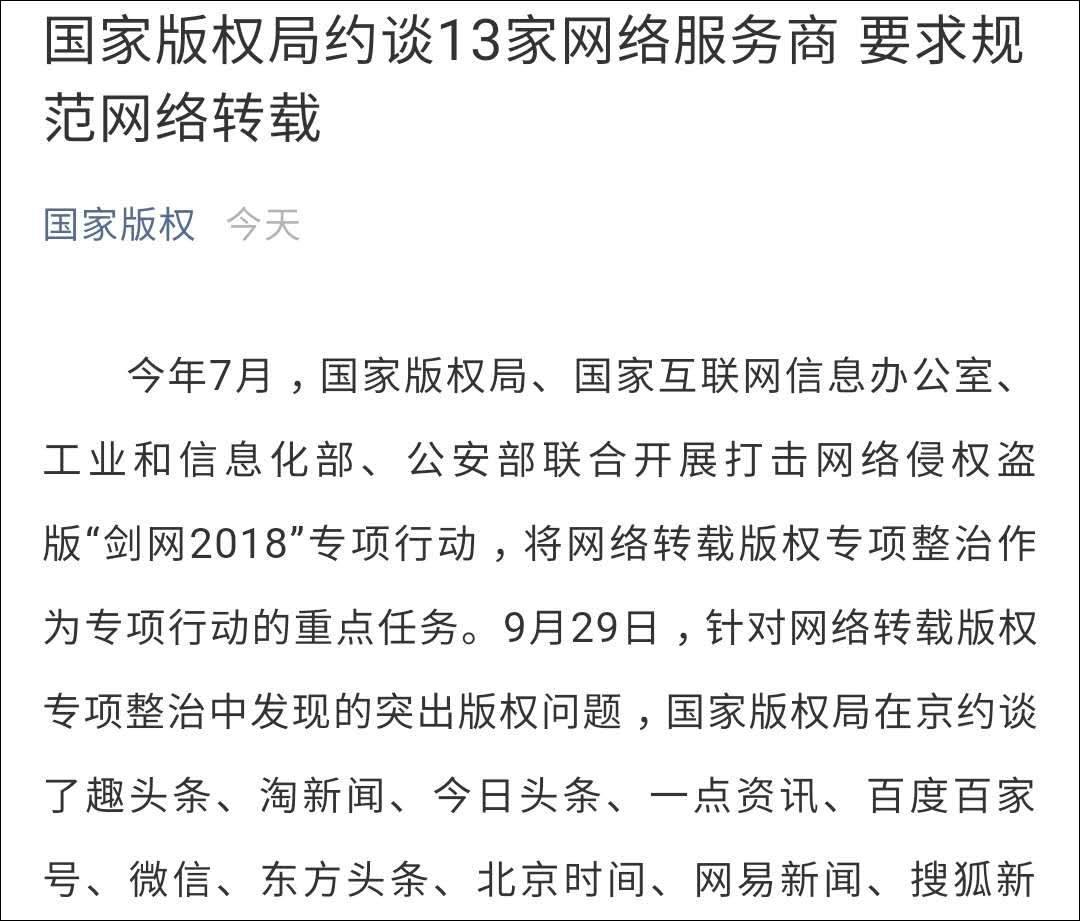 今年7月,國家版權局、國家互聯網信息辦公室、工業和信息化部、公安部聯合開展打擊網絡侵權盜版“劍網2018”專項行動,將網絡轉載版權專項整治作為專項行動的重點任務。9月29日,針對網絡轉載版權專項整治中發現的突出版權問題,國家版權局在京約談了趣頭條、淘新聞、今日頭條、一點資訊、百度百家號、微信、東方頭條、北京時間、網易新聞、搜狐新聞、新浪新聞、鳳凰新聞、騰訊新聞等13家網絡服務商,要求其進一步提高版權保護意識,切實加強版權制度建設,全面履行企業主體責任,規範網絡轉載版權秩序。