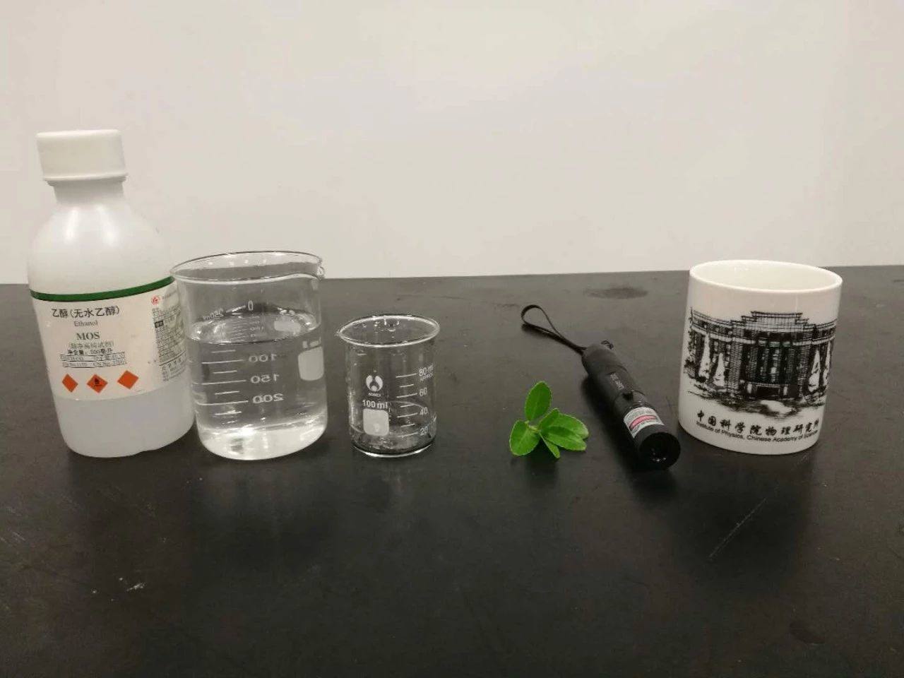 實驗器材:所標杯、綠色樹葉、酒精、小燒杯、一杯熱水、藍紫色激光筆。