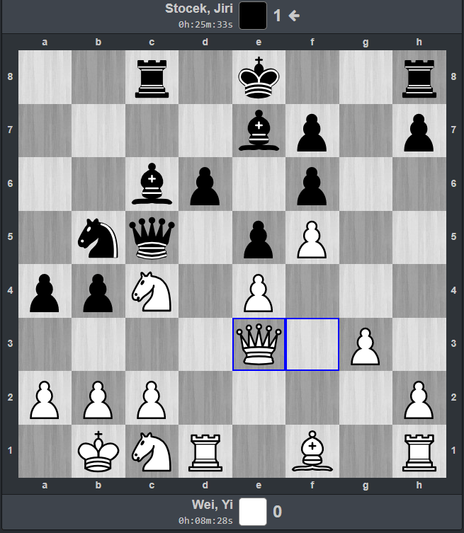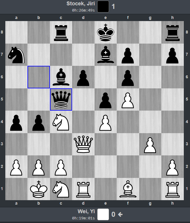 1. e4 c5 2. Nf3 Nc6 3. Nc3 d6 4. d4 cxd4 5. Nxd4 Nf6 6. Bg5 e6 7. Qd2 a6 8. O-O-O Be7 9. f4 Bd7 10. Nf3 b5 11. Bxf6 gxf6 12. Kb1 Qb6 13. g3 b4 14. Ne2 a5 15. f5 e5 16. Nc1 Rc8 17. Qd5 Na7 18. Nd2 Bc6 19. Qd3 a4 20. Nc4 Qc5 21. Qf3 Nb5 22. Qe3 Nd4 23. Bd3 d5 24. Nd2 a3 25. exd5 Bxd5 26. Ne4 Qc6 27. Nb3 O-O 28. Rhe1 Nxc2 29. Qh6 Bxb3 30. Ng5 Bxa2+ 31. Kc1 Nxe1+ 32. Kd2 Nf3+ 0-1