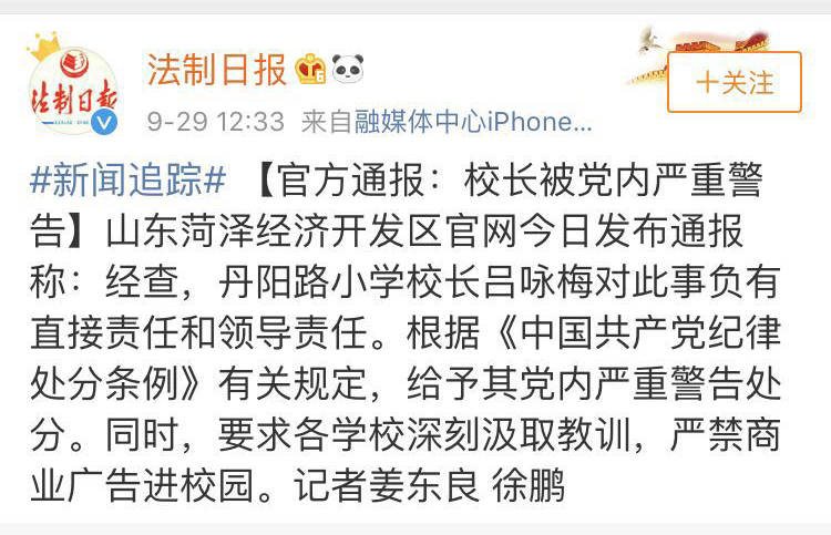 山東菏澤經濟開發區官網今天發佈通報稱:經查,丹陽路小學校長呂詠梅對此事負有直接責任和領導責任。根據《中國共產黨紀律處分條例》有關規定,給予其黨內嚴重警告處分。同時,要求各學校深刻汲取教訓,嚴禁商業廣告進校園。
