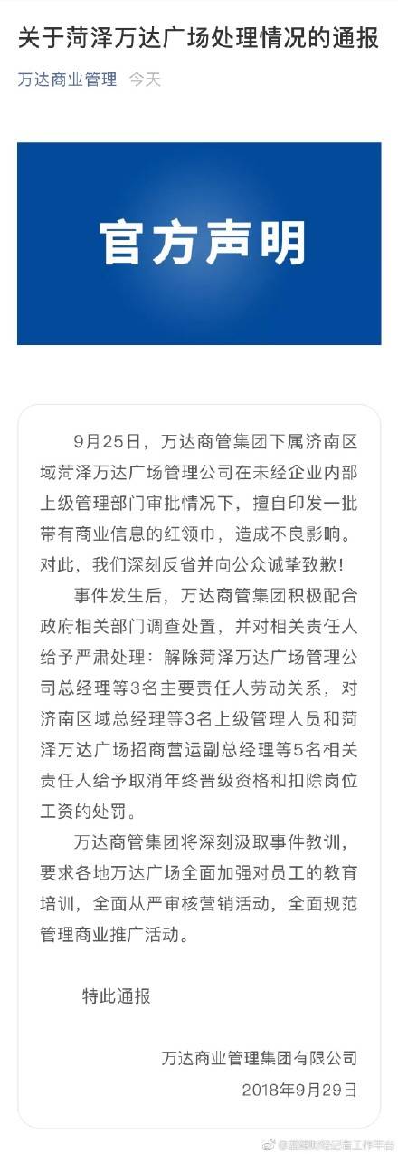 29日下午,萬達通報紅領巾印廣告事件:菏澤萬達廣場管理公司總經理等3人被解聘,濟南區域總經理等3名上級管理人員和菏澤萬達廣場招商營運副總經理等5名相關責任人取消年終晉級資格和扣除崗位工資。