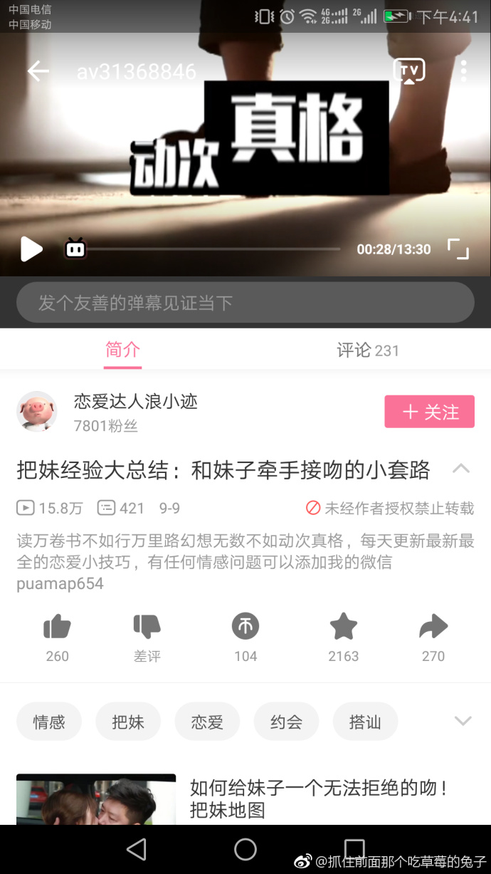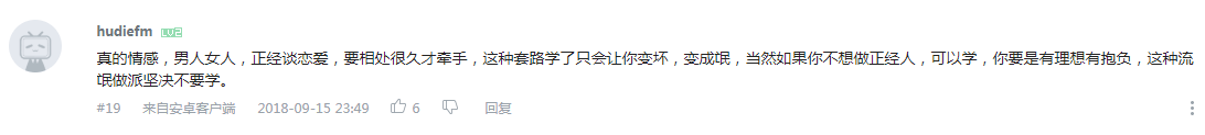 “真的情感,男人女人,正經談戀愛,要相處很久才牽手。這種套路學了只會讓你變壞,變流氓。當然如果你不想做正經人,可以學,你要是有理想有抱負,這種流氓做派堅決不要學。”
