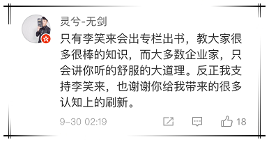 在眾多討論聲中,@靈兮-無劍抒發了自己對李笑來的感謝和支持。