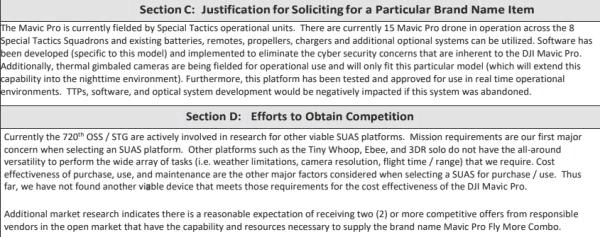 採購文件顯示,其他品牌的無人機平台無法滿足美國空軍執行多種任務時所需要的條件,如氣候適應性、相機分辨率和續航時間等。