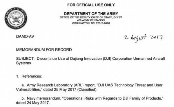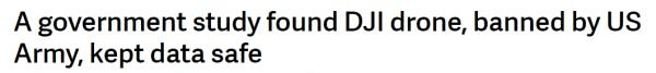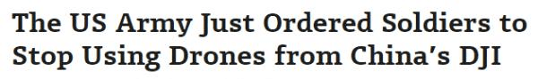 據美國“防務一號”網站去年8月報道,美國陸軍於8月2日發佈一份備忘錄説,由於大疆無人機具有“網絡安全漏洞”,已要求在全陸軍範圍內禁止使用,備忘錄還要求美國陸軍停止使用並卸載一切大疆相關產品。
