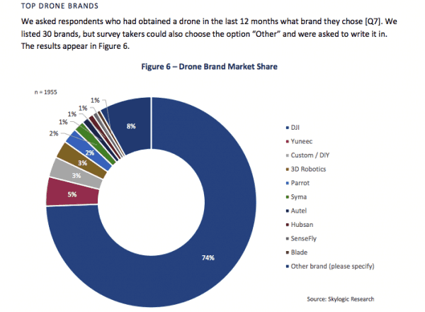 DroneGirl網站援引的無人機市場調查公司Skylogic Research本月發佈的行業報告則提供了更為有説服力的數據:去年大疆在美國市場的佔有率是72%,而被美軍“封殺”一年後,這一數字不降反升,達到約74%。
