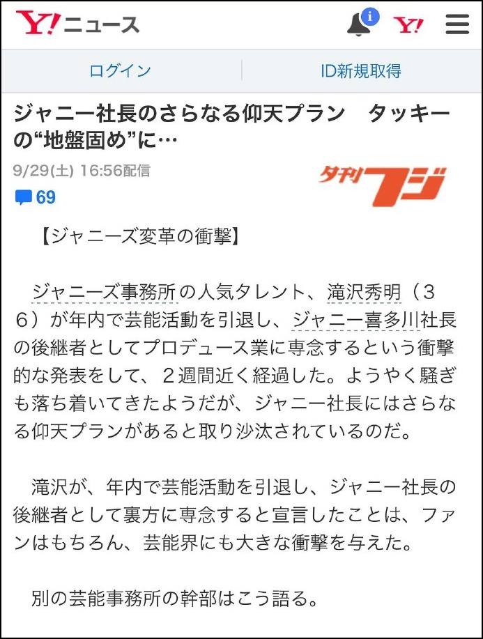 直到上個月29日,日本雜誌《週刊文春》報道,社長Johnnys喜多川即將退位,並點名瀧澤秀明為繼承人,關於瀧澤秀明接任社長的正式消息將不日公佈。
