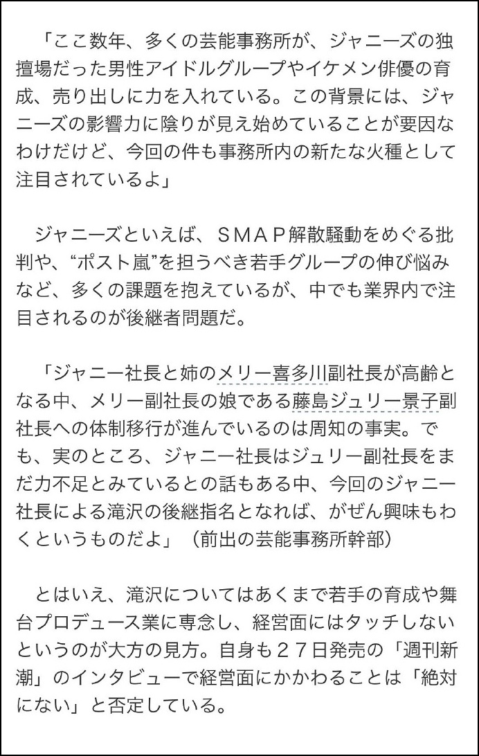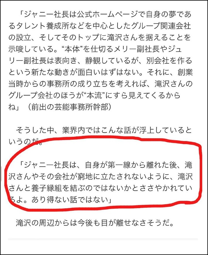 在傑尼斯社長喜多川和姐姐梅利多川副社長的高齡的情況下,副社長的女兒藤島朱麗景副社長的體制轉移是眾所周知的事實。但是,實際上,傑尼斯社長曾認為朱莉副社長還沒有這個能力。在這樣的情況下,業界內也出現了這樣的話題。傑尼斯社長,在自己離開第一線之後,為了不讓瀧澤先生和公司陷入窘境,就和瀧澤先生聯繫了養子親,不是不可能的。