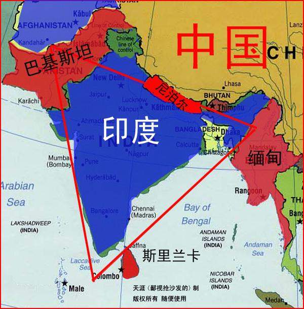 這個點是哪個呢?地圖上標着明明白白,就是斯里蘭卡。坦白説印度當年還在大英帝國時,最失策的就是沒有把斯納入國土範圍。這個點不管被誰佔了都將打破印度的大國夢。感謝英國,感謝甘地,不然我們只有在馬爾代夫找機會了。