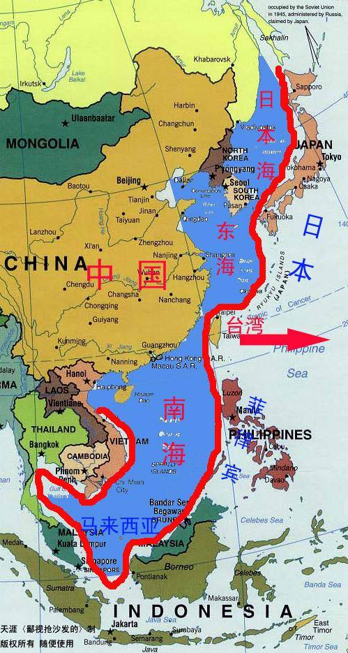 看了上面這張圖大家就清楚了吧!中國沿海可以分為三個區域——日本海——東海——南海,也就是説要想殺出去成為全球性大國就必須從這三個區域中找條路出去。