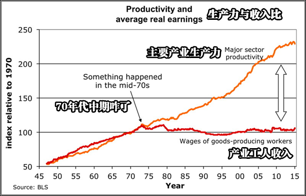 1970年代發生了民權運動。這導致資本主義失去了他們的“基本盤”——數量龐大的可剝削黑人。既然他們不能合法剝削黑人了,怎麼辦呢?那就一視同仁,剝削所有人。之後收入就不再提高了。