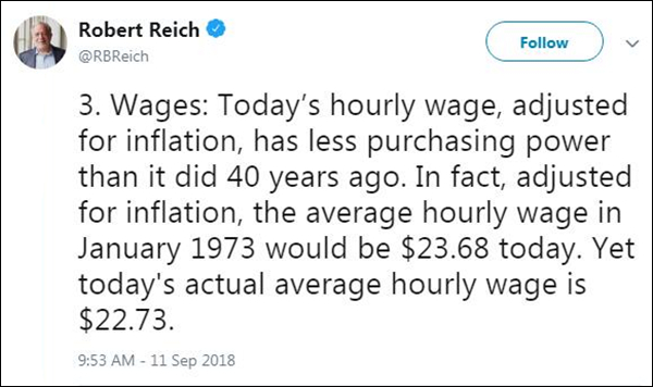 我們從最基本的經濟生活的現實説起。先説金融,美國事實收入從1971年開始就已經停止增長了,從那之後基本沒什麼增長。根據購買力計算,1973年的時薪購買力相當於今天的23.68美元,而今天美國的平均時薪為22.73美元。