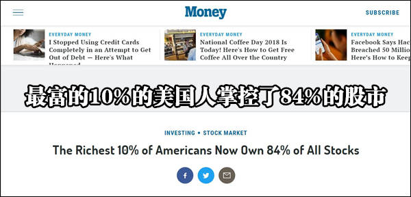 説到股票,其實這跟很多人都沒什麼關係。只有一小部分美國人從美國股市中獲益。10%的美國家庭掌控了美國84%的股票市值。