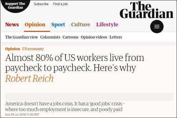 現在80%的美國人都是月光族,工資不按時發就活不下去。70%的美國人沒有辦法儲蓄1000美元應對突發情況。可以説今天所有的美國人都是破產的,靠負債生活。