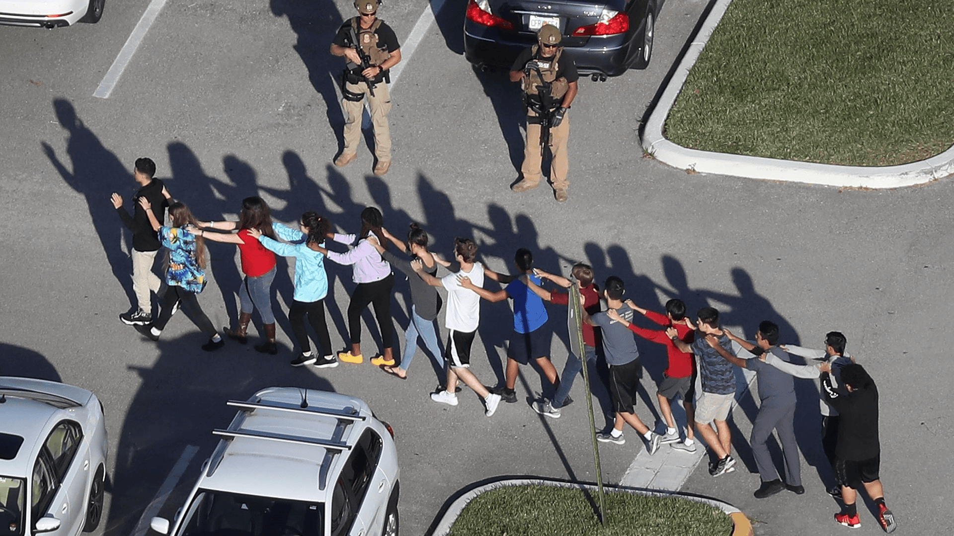 2018年2月14日,美國佛羅里達州布勞沃德縣帕克蘭的一所高中發生槍擊案。該事故共造成17人死亡,17人受傷,而槍手的辯護律師則表示,被告有嚴重的精神問題。事後美國多地爆發百萬人大遊行呼籲控槍,而特朗普總統則認為讓老師配槍才是預防校園槍擊的好方法。(圖片來自Getty Images)