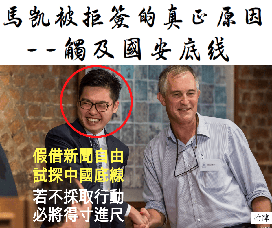 【馬凱被拒簽的真正原因---觸及國安底線】馬凱為什麼不獲續簽,是否與他所掌管的FCC替「港獨」搭台播「獨」,他自己心裏最清楚。有人是利用陳浩天演講一事,來試探中央的底線,若中央及特區政府不採取行動,必將得寸進尺。事實上,任何觸及中國底線、替「港獨」張目、破壞香港繁榮穩定的任何人、任何事,都絕不會被容忍。反對派昨日説這是「秋後算帳」,某種程度上沒有沒錯,這就是「算」一筆「外國勢力撐『港獨』的帳」!