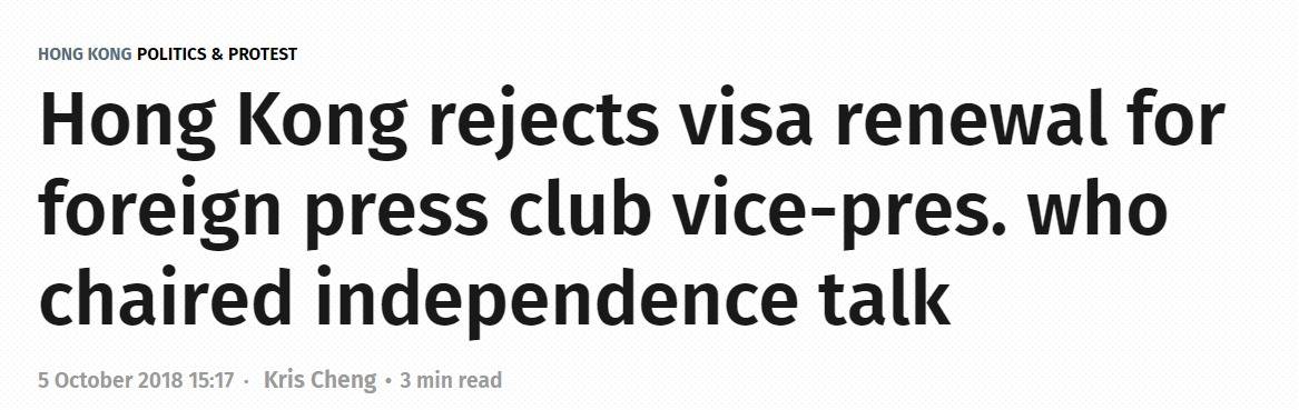據香港自由報(HKFP),香港外國記者會(FCC)第一副主席、現為英國《金融時報》亞洲新聞部編輯的Victor Mallet 工作續簽被香港入境處拒絕。金融時報發言人稱這是他們第一次在香港遇到這種問題,而且未被告知拒絕的原因。