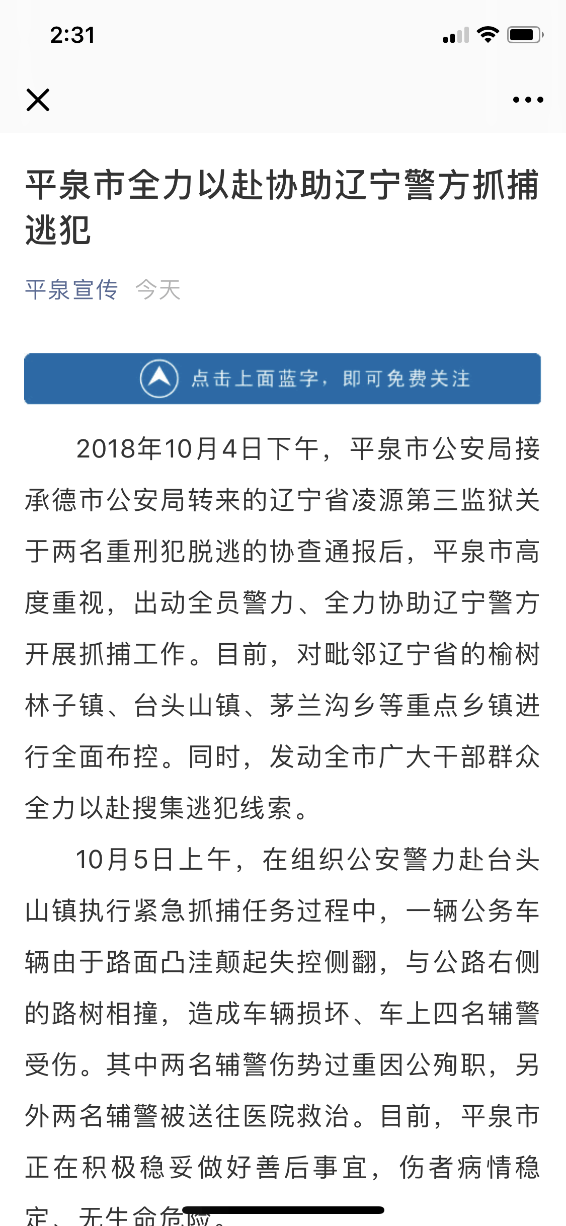 據新京報報道,10月5日,河北省平泉市人民政府發佈一份報告稱,10月5日上午9時許,平泉市公安局4名輔警在執行緊急抓捕凌源第三監獄兩名越獄逃犯任務的途中發生車禍,2名輔警殉職,2名輔警受傷。